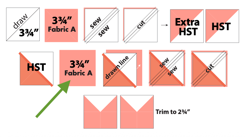 The diagram is mis-labled and should show a 3-1/4” Fabric C square (not a Fabric B square). The instructions should read: “Draw a diagonal line on wrong side of one 3-1/4” Fabric C square…the rest is correct. Cutting instructions are correct, thank goodness! :)