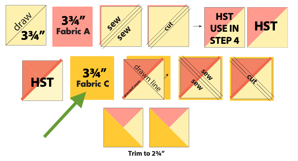 Step 3. Diagram should show HST being paired/sewn with a 3-3/4” Fabric C square (not 31/2”). Written instructions should also be corrected to reflect this change.